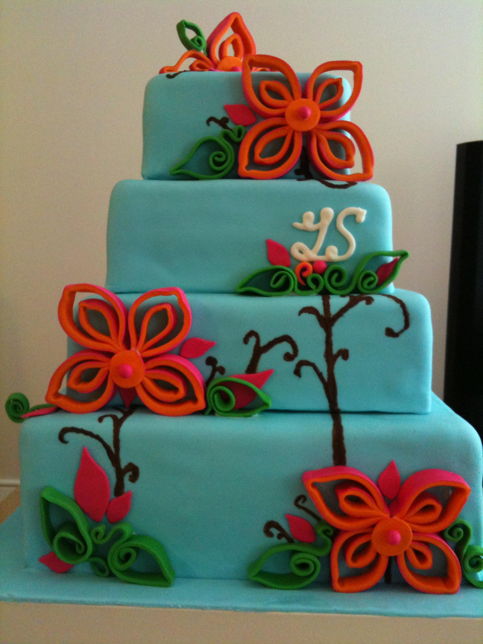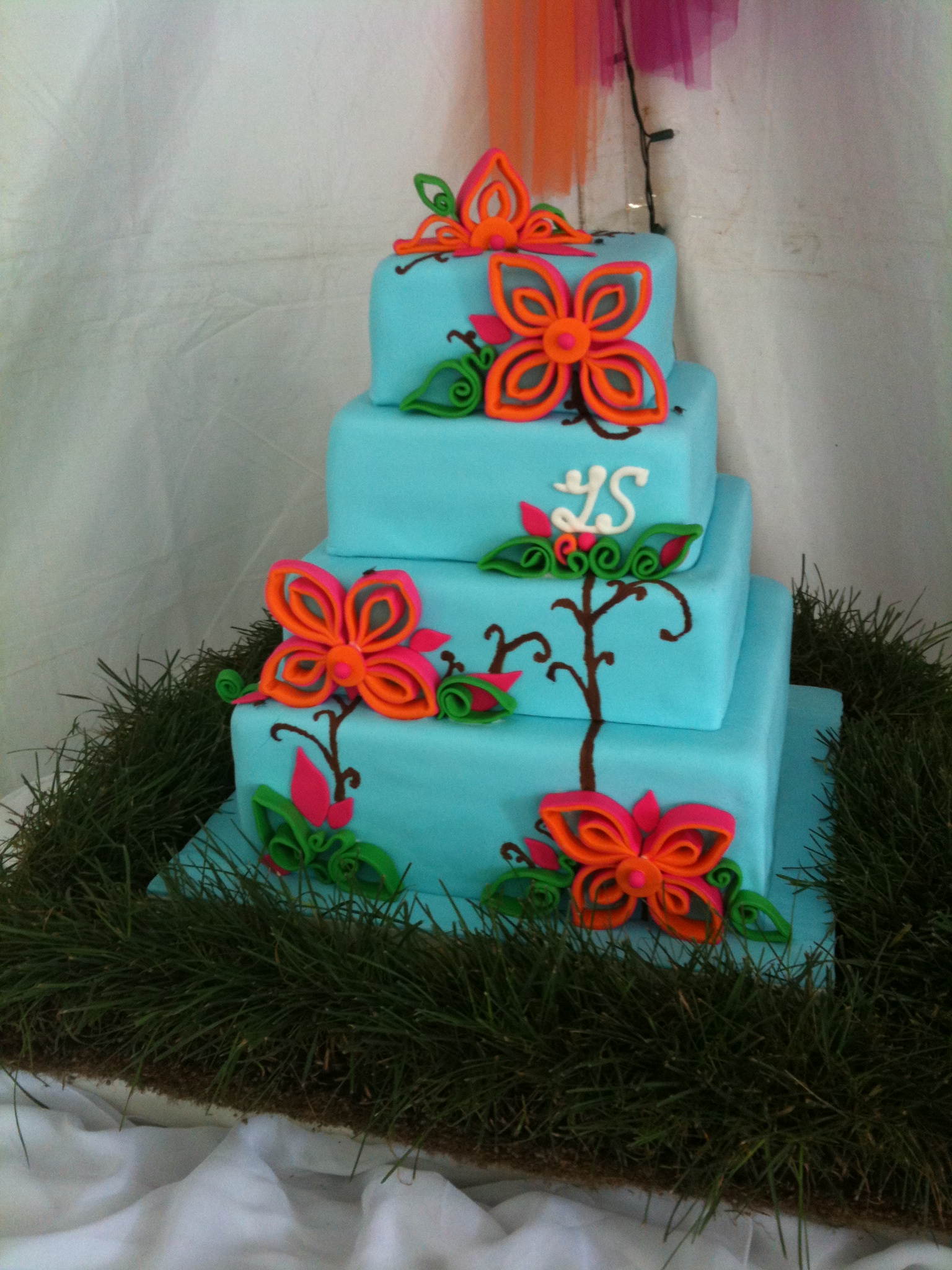 The nightmare ride wasn’t over yet, we drove an hour to get to Louiseville and got there just before the ceremony at my neighbor’s wedding. I put the cake down and noticed a few cracks on both bottom layers. I now bring coloured royal icing in a bag as part of an emergency repair kit. No matter, the cake was covered in house flies within a few minutes. It was an outdoor wedding and the reception was to be held in a tent. It suited the space perfectly. We put grass all around the cake – real grass!