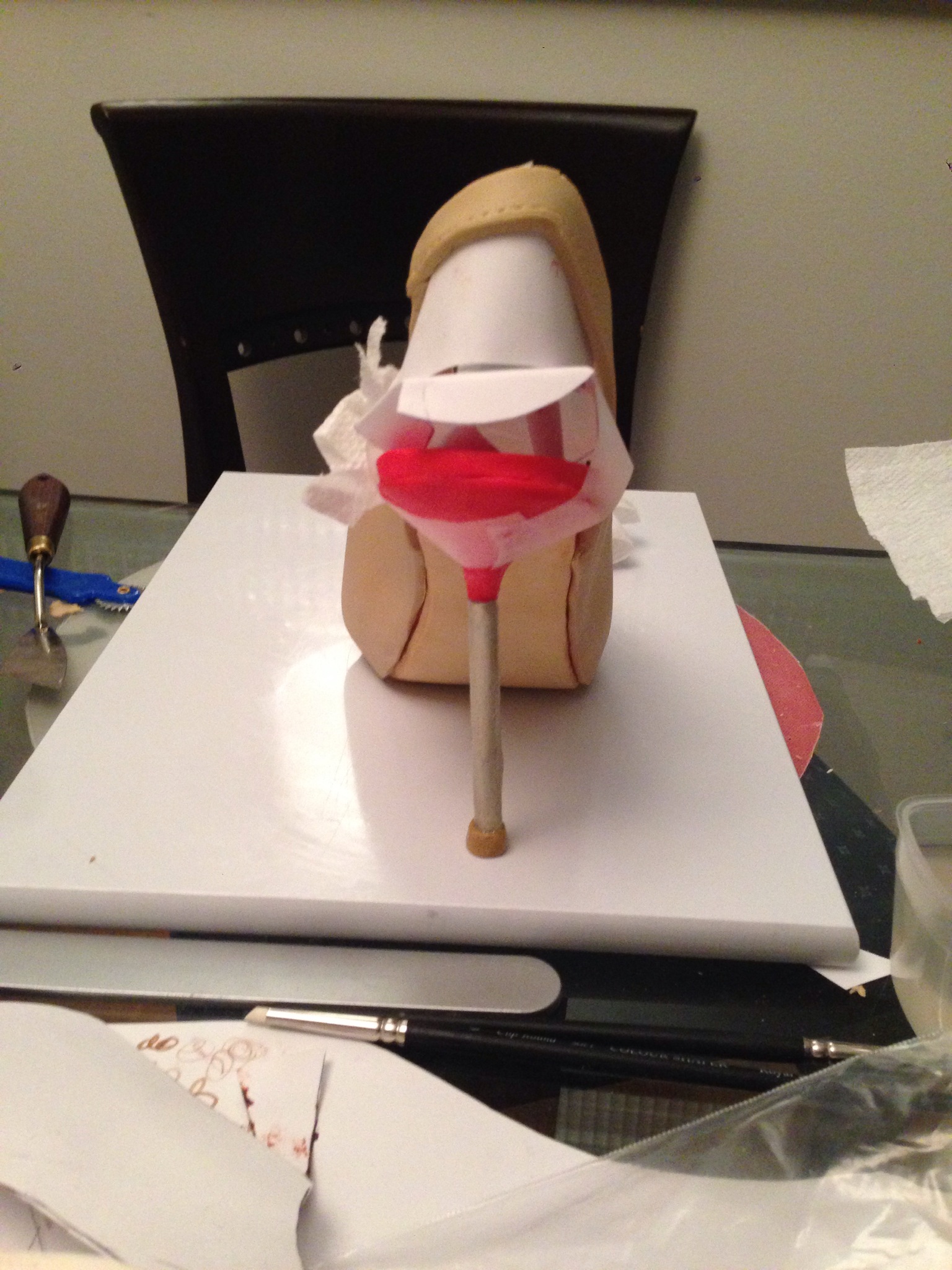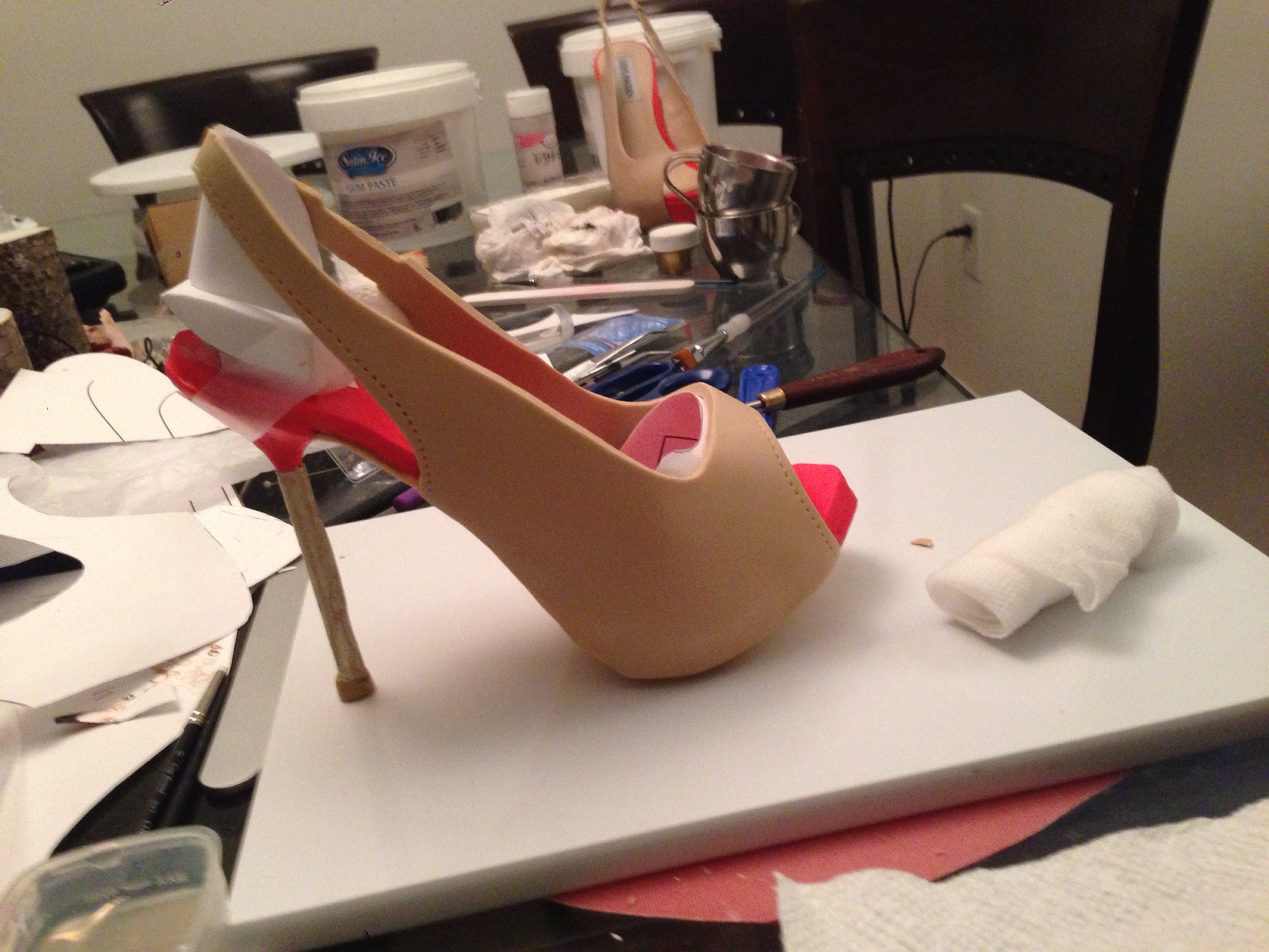 The sole and heel are made in pastillage. This is similar to gum paste but has a high quantity of tylose (CMC) and icing sugar. It is very easy to make but working with it is scary. It must remained covered at all times.