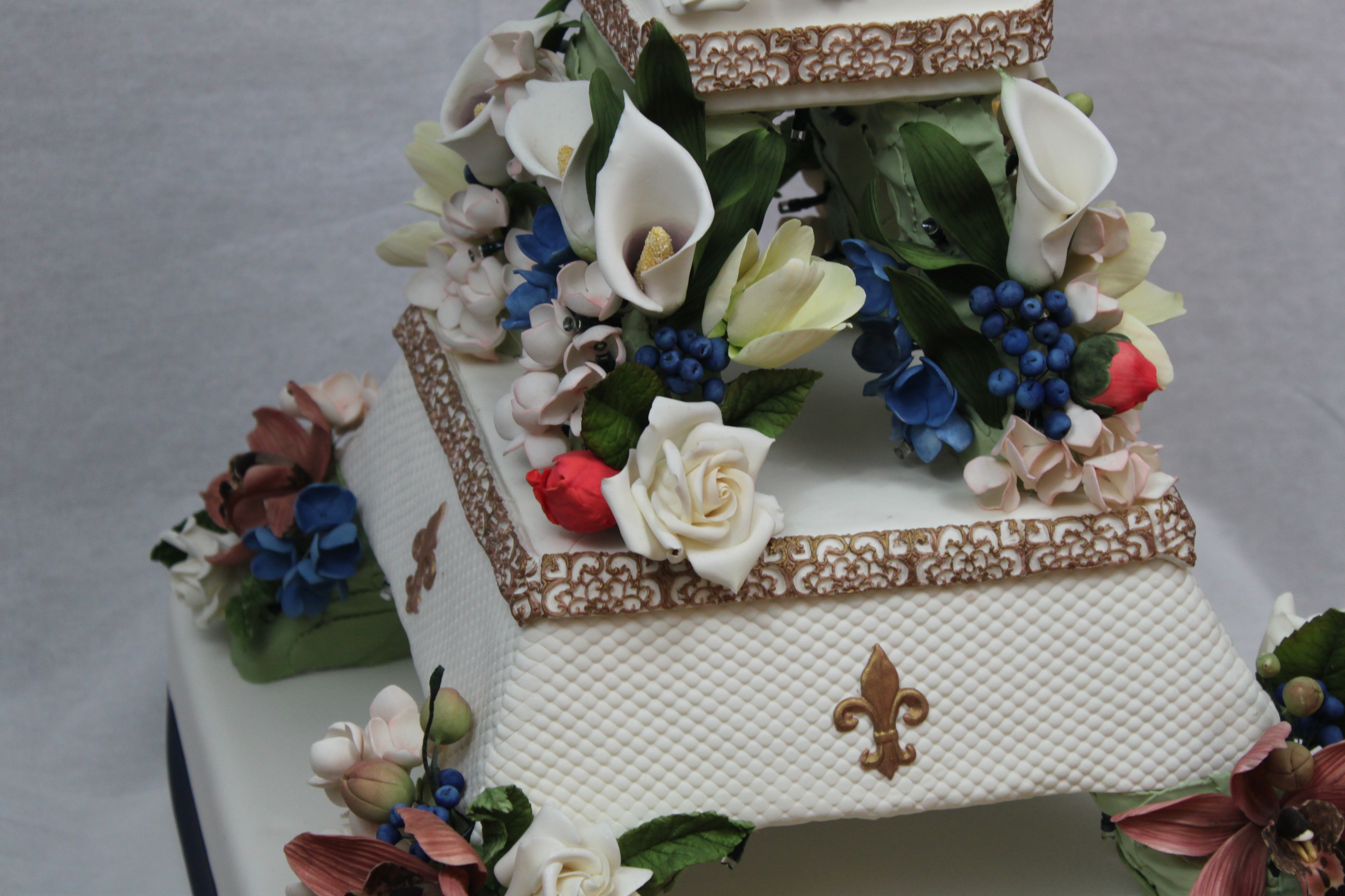 I waited a full three years before taking the tower apart, I simply couldn’t imagine discarding something that took so many months to create. Yes, those are string led lights on the cake, they were hidden under the green foliage that covered the Styrofoam and the flowers and blueberries were stuck into the foam through the foliage so you could just see the little lights if you looked very closely.