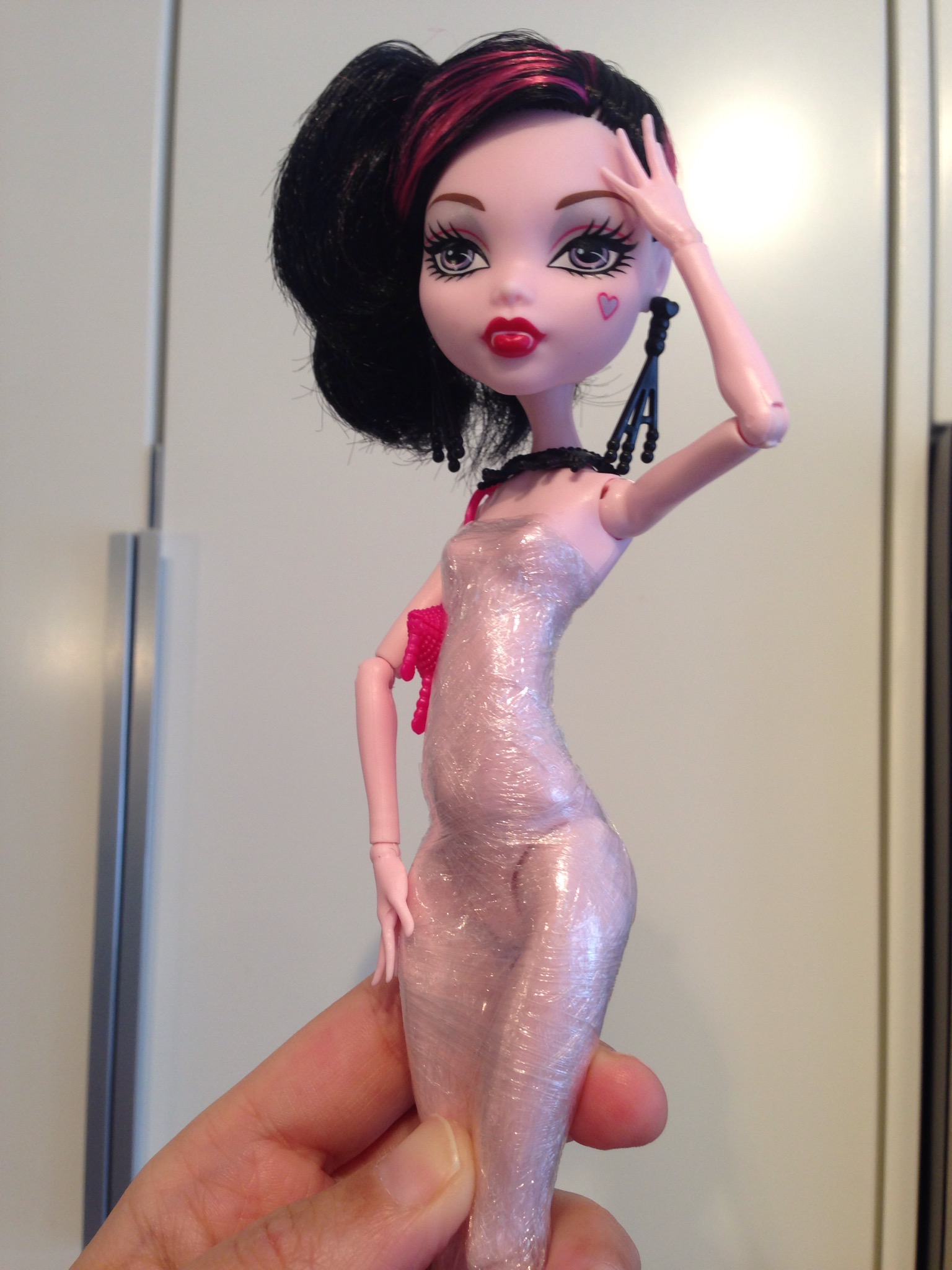What with all the weight on those cupcakes I needed a support system so Draculaura could hold the 12th one that would have the 6 on it. A dowel and a wire frame held everything in place. For the pre-delivery photo shoot I cut out the Monster High logo from the doll box and let her sweetly ball-jointed articulate little hands hold it up.