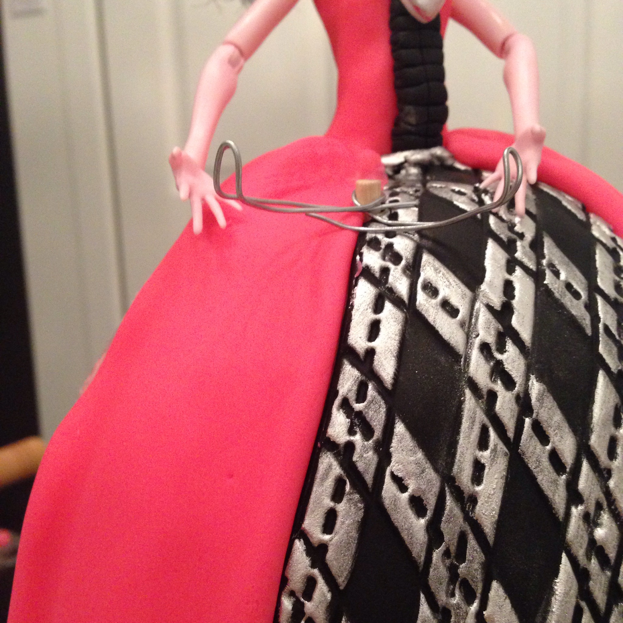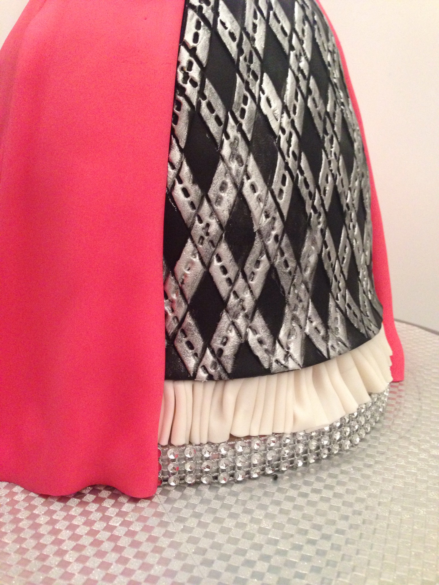 The front panel of the skirt was made using an impression mat. I painted the raised areas with silver dust mixed with food grade ethanol (thanks hubby ). Nothing quite paints like this dust/ethanol mix. It in fact is too good, there is very little room for trial and error and getting silver on a black diamond or inside the dotted lines proved to be a nightmare to remove.